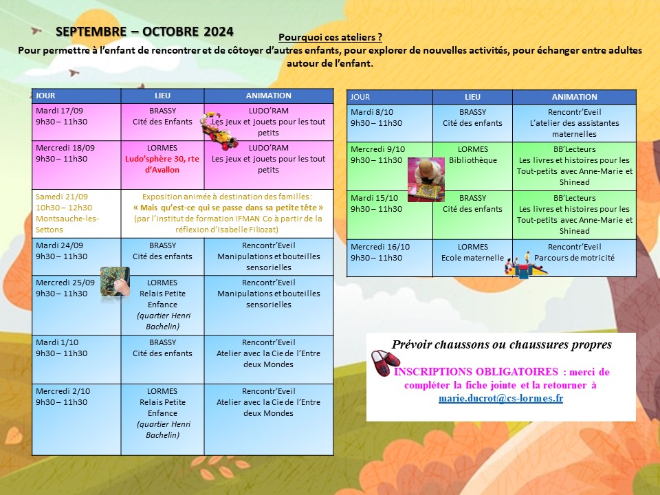 Les horaires proposés correspondent au créneau de l’animation, mais les heures d’arrivée et de départ restent libres en fonction des besoins de l’enfant.
