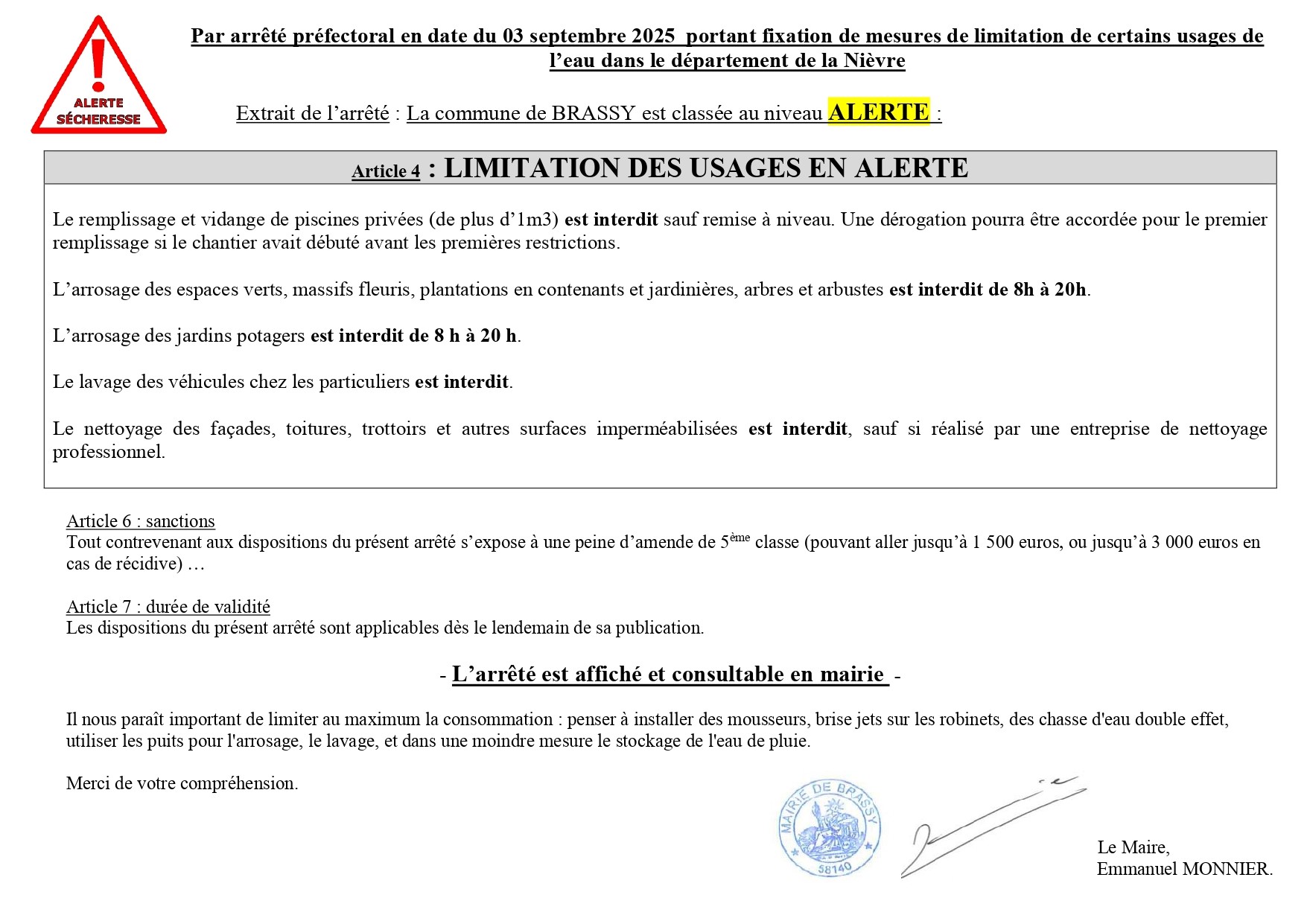 Suite à un nouvel arrêté préfectoral n° 58-2025-09-03-00002 en date du 3 septembre 2025, la commune de Brassy est classée au niveau ALERTE.